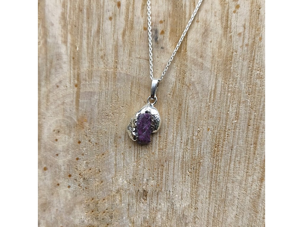 Tento šperk vznikl v našich rukách technikou vmačkávání. Surový, neopracovaný rubín je zasazený v přirozené podobě, bez zásahů do jeho struktury. Díky jedinečnosti kamene i samotné technice zpracování je tento náhrdelník jediný na světě.