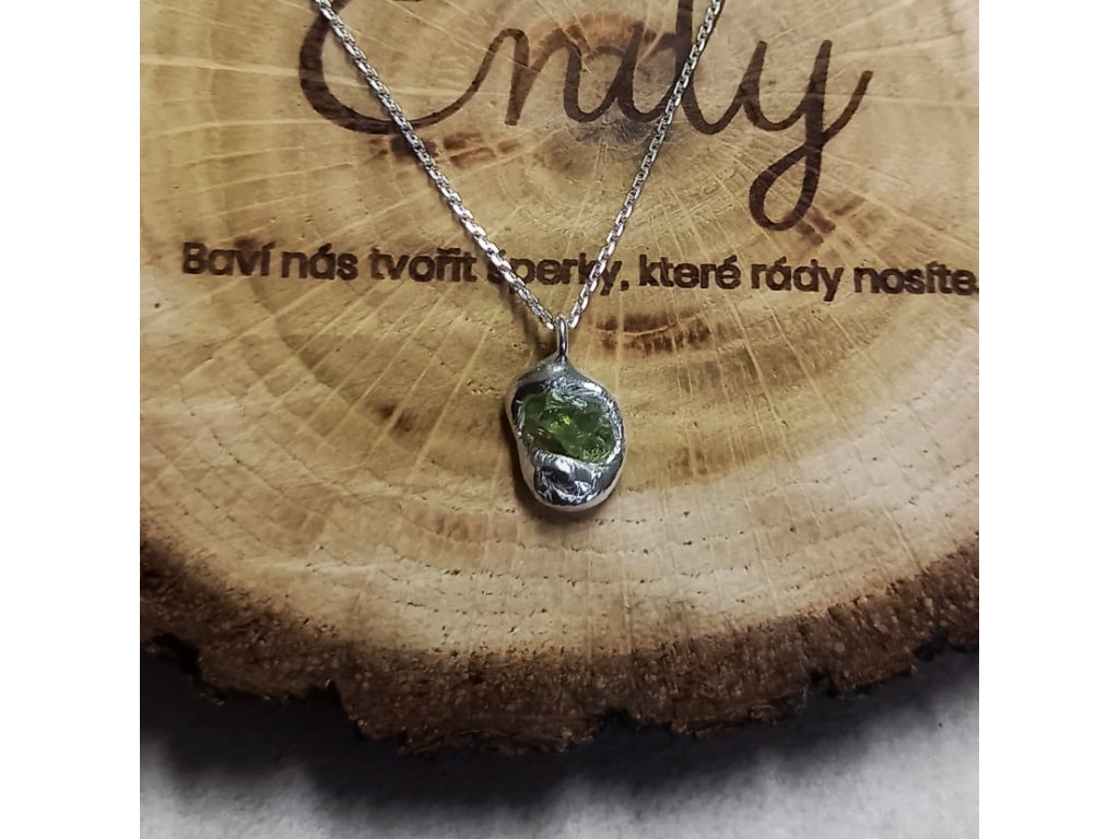 Stříbrný organický náhrdelník s olivínem. Olivín přírodní neopracovaný.