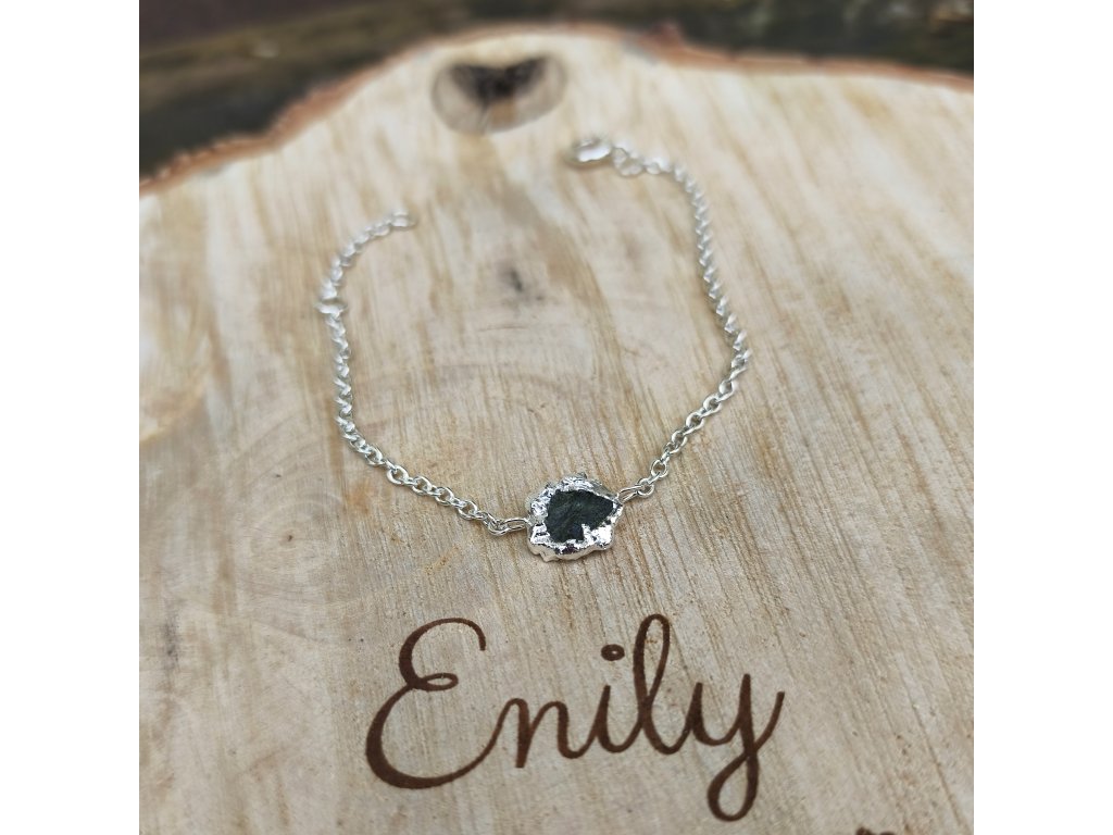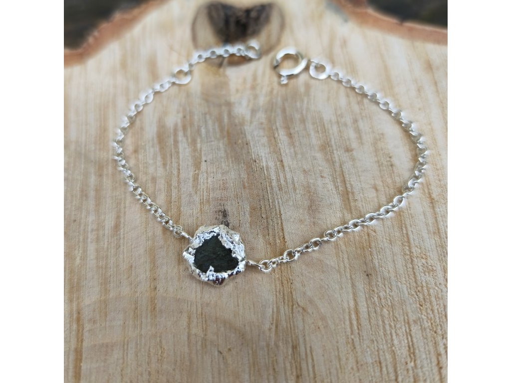 Tento šperk vznikl v našich rukách technikou vmačkávání. Surový, neopracovaný vltavín je zasazený v přirozené podobě, bez zásahů do jeho struktury. Vzhledem k přiíodnímu kameni v surovém stavu a samotné technice zpracování je tento náramek jedinečný.